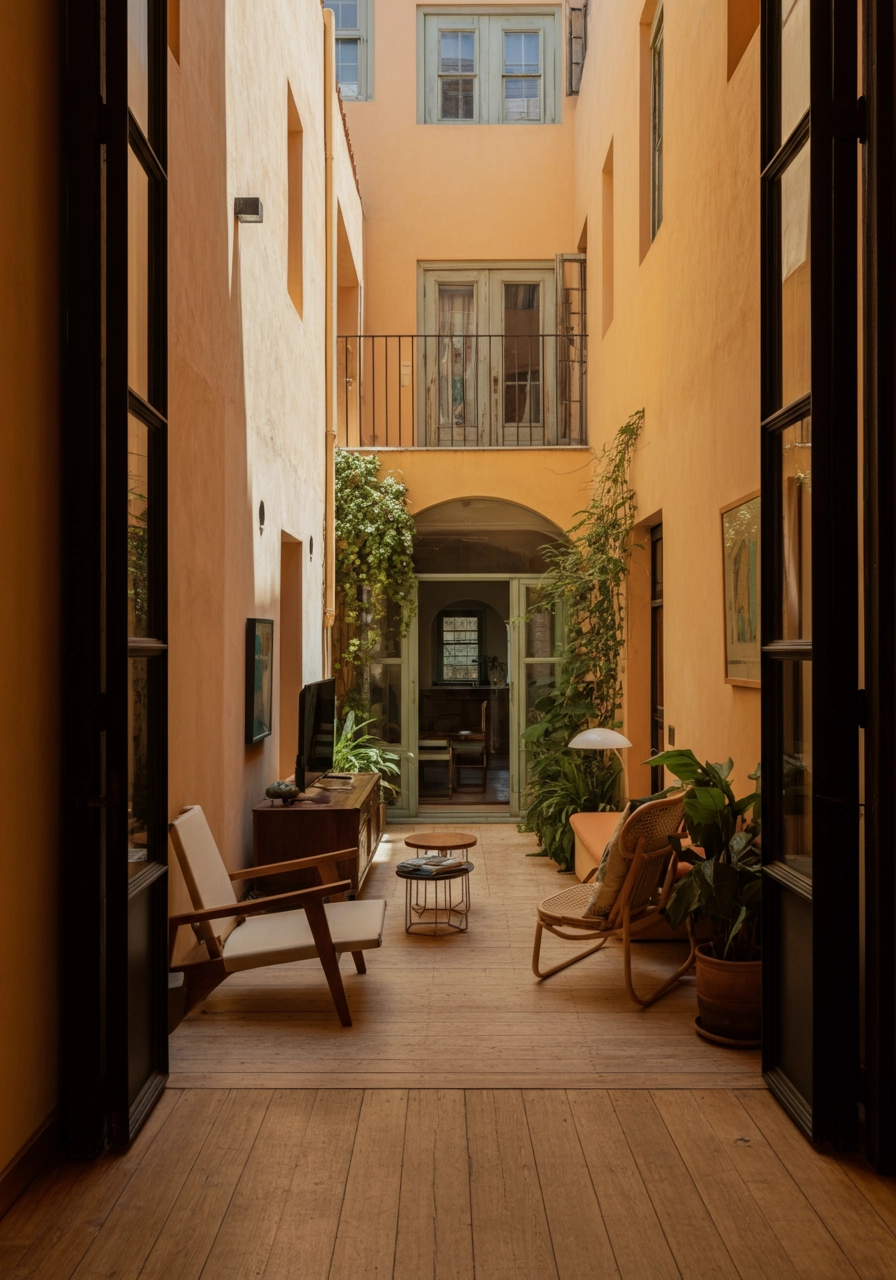 Architecture image of an open living room of a house between buildings with views to an interior courtyard with a very small pool. Minimalism style combined with mediterranean, some wood.