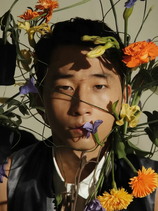 A young man looks solemnly into the camera, surrounded by a variety of vibrant flowers and twisting vines around his face. He's wearing a sleeveless white vest. The background is dark, muted color to create a contrast between the subject and the flowrs.. The lively colors of the flowers—orange, yellow, and purple—stand out against the natural lighting, creating a harmonious blend of nature and fashion. The close-up, centered composition emphasizes the intricate details of the floral arrangement and the contemplative mood, evoking a sense of introspection and connection with nature. It's a high fashion editorial photography