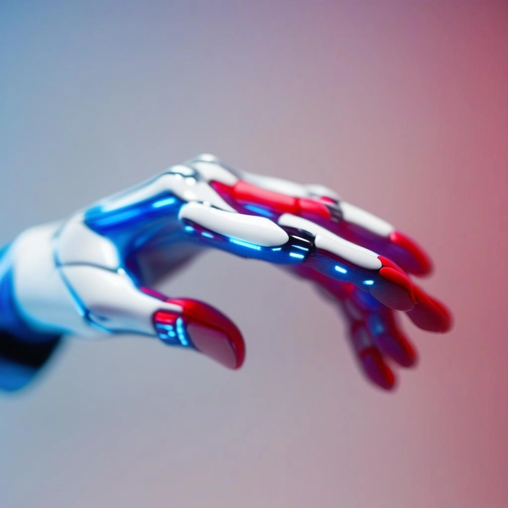 gesturing hand with futuristic robotic-cyborg aesthethics, soft gradients and textures in red, blue and white colors image background , with a plain colored background.