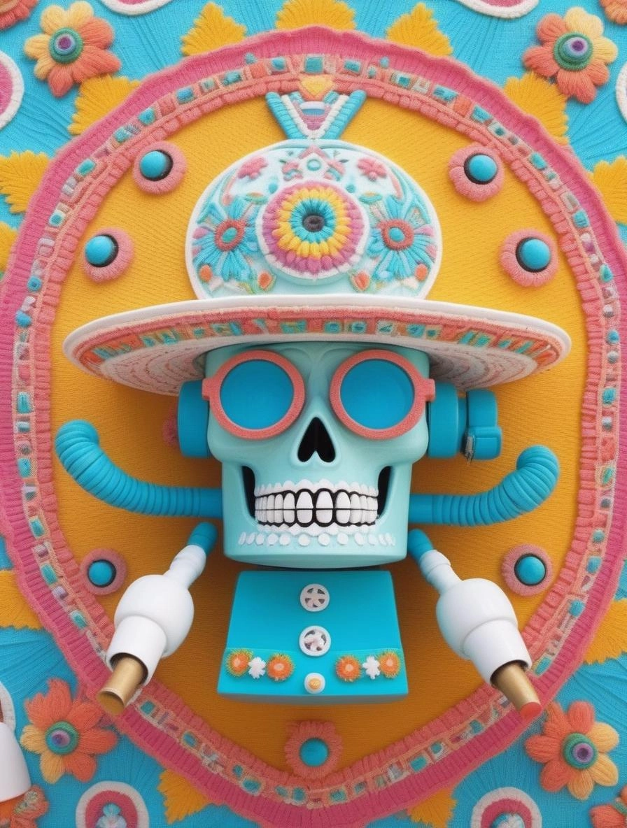 SHOOTING A GUN AT THE CAMERA, 3d portrait render of a retro futuristic MEXICAN SUGAR SKULL ROBOT HUICHOL WITH SOMBRERO, GIANT HEAD NARCO ROBOT WITH A GUN, SHOOTING A GUN TOWARDS THE CAMERA, wearing quirky goggles and elaborate traditional Mexican mariachi Attire, clothing has Mandelbrot Fractal embroideries, against a Vibrant RAINBOW background with rainbow accents and rays of light