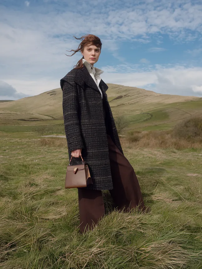 A stylish young white model woman stands confidently in an open grassy landscape, wearing a textured dark coat with a crisp white collar. She's holding a brown handbag with a distinctive handle. The background features rolling hills under a blue sky dotted with white clouds, creating a serene and expansive setting. She has brown hair that's flowing with the air. The lighting is natural, highlighting the contrast between the person's attire and the earthy tones of the landscape. The composition presents a balanced view, capturing the elegance and poise of the subject against the backdrop of nature, conveying a sense of tranquility and sophistication.