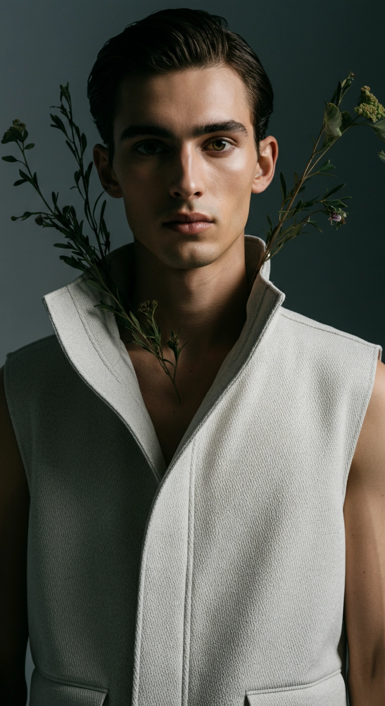 A young man looks solemnly into the camera. He's wearing a sleeveless white vest. The background is dark, muted color. creating a harmonious blend of nature and fashion. The close-up, centered composition emphasizes the intricate details of the clothes and the contemplative mood, evoking a sense of introspection and connection with nature. It's a high fashion editorial photography