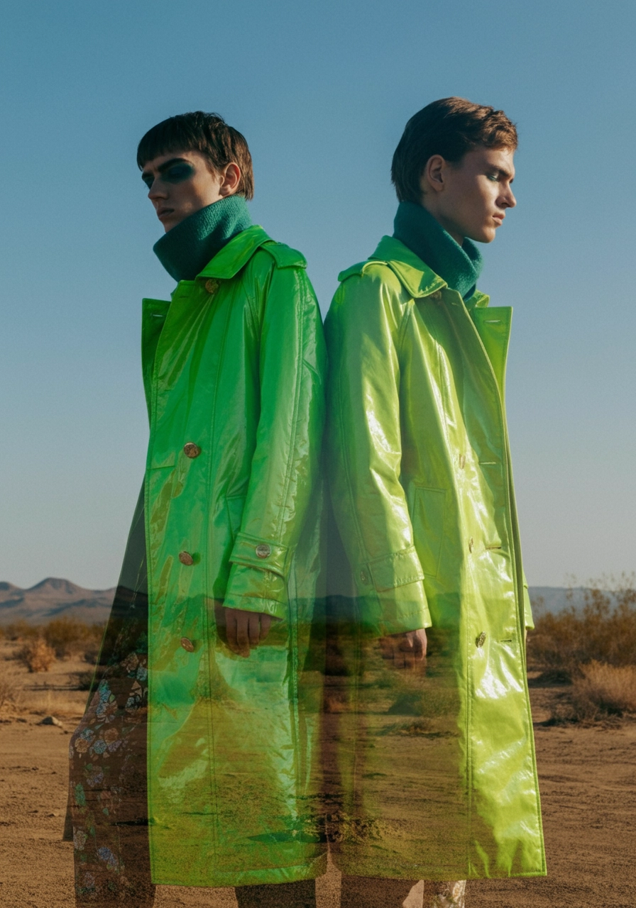 Photo of two models wearing shiny long neon green coats in the desert. The background is blue sky no clouds. In the style of surreal fashion photography and surreal digital art, with double exposure and a futuristic style.