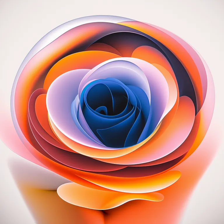 An abstract, swirling pattern resembling a rose, with smooth, overlapping layers. The center features deep blue hues, gradually transitioning to vibrant orange and soft purple towards the outer edges. The background is a pale, neutral tone, emphasizing the vivid colors. Gentle lighting enhances the fluid, translucent quality of the layers, creating a serene and mesmerizing atmosphere. The composition is a top-down perspective, focusing on the harmonious blend and flow of colors, evoking a sense of calm and elegance.
