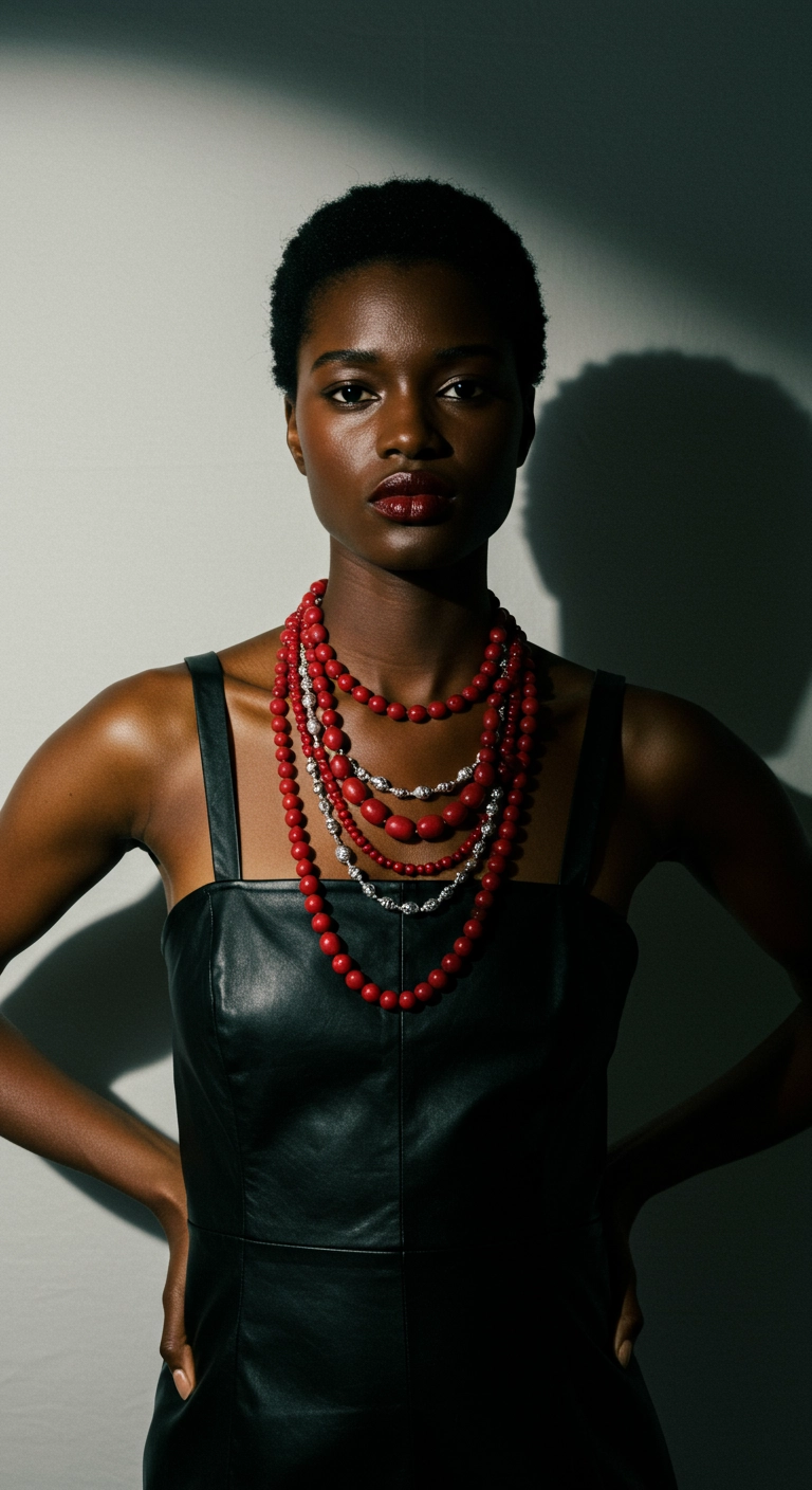Fashion editorial portrait of a confident Black woman wearing a black leather dress with thin straps, accessorized with layered chunky necklaces of red and silver beads. Hard flash lighting with a plain off-white background, direct flash photography for a raw, edgy aesthetic with dark shadow in the background from the lighting. Strong pose, minimalistic composition, high-fashion, bold and unapologetic vibe with film grain.