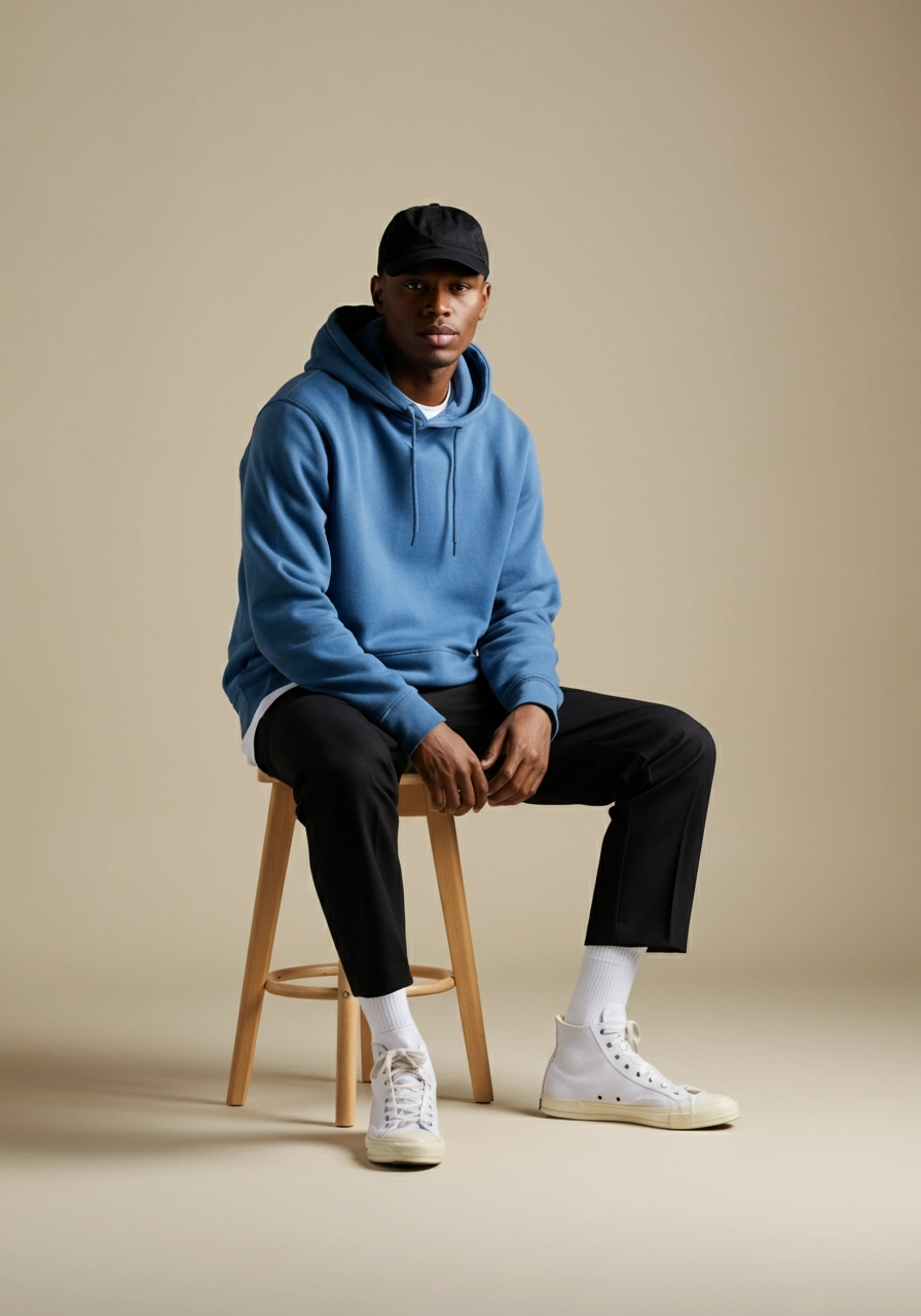 A minimalist and modern portrait of a stylish young man confidently seated on a beige stool, wearing a blue hoodie, black pants, white high-top sneakers, and white socks. He sports a black cap, exuding a relaxed and calm confidence. The scene is set against a cozy, beige background with soft lighting that casts gentle shadows, emphasizing neutral tones. Captured at eye level with a Fujifilm X-T4 and XF 50mm f/2 R WR lens, the composition follows the Rule of Thirds, enhancing the subject's presence with subtle negative space.