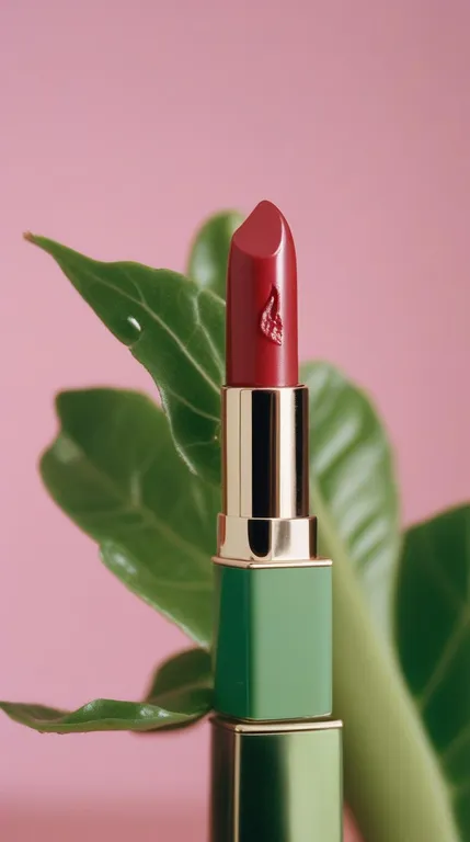 vintage lipstick with plant sprouting, held between fingers with green nail polish, soft pastel background, 70s style advertisement