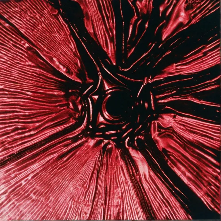 an abstract with soft textures and gradients with focused on red and black colours image that represent alien invassion during a techno rave