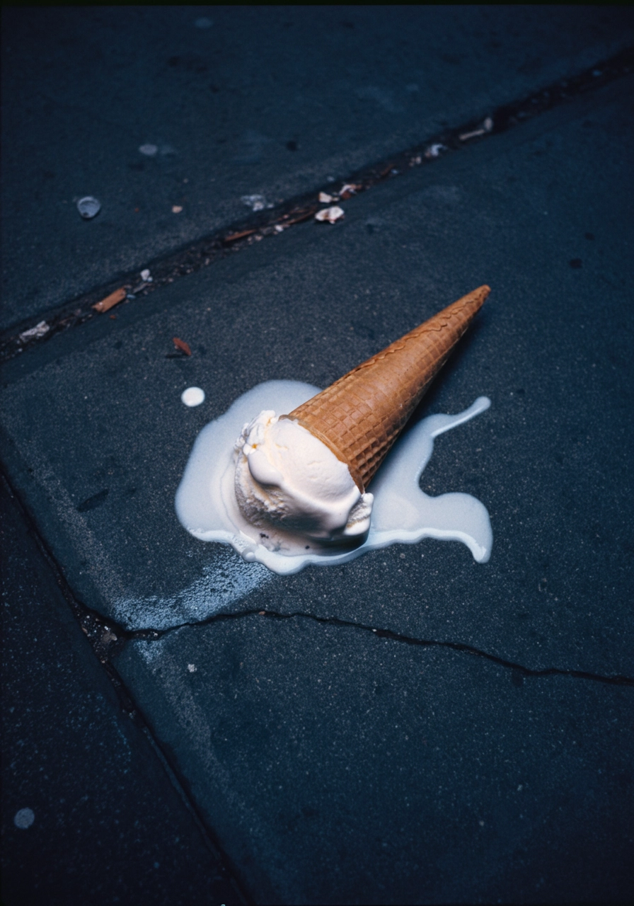 A realistic, editorial-style photograph captured on 35mm film, shot from directly above, of a melting ice cream cone dropped onto a humble sidewalk in a neighborhood like Queens or Brooklyn at dusk. The image has noticeable grain, strong contrast, and subtle flash, blending modern sensibility with artistic nostalgia. The composition feels candid and unstaged, emphasizing authentic textures of cracked concrete, scattered debris, and the soft glow of fading urban light, creating a moody, immersive atmosphere. Color grading is rich yet restrained, evoking contemporary editorial photography with a distinctly 1990s aesthetic—strongly atmospheric without appearing overly stylized.