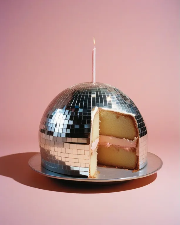 a disco ball cut in half with cake inside, '70s ad style, plain light pink background