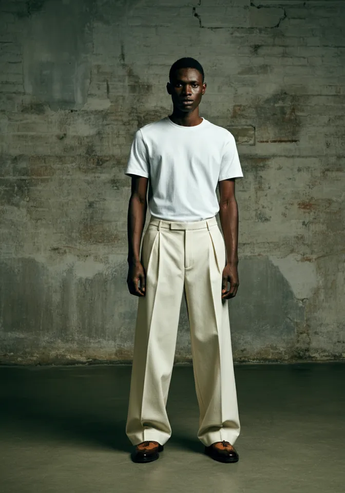 Male model wearing a nice white tshirt. he is also wearing wide leg white pants. he is wearing nice shoes. an old school vibe. the background and atmosphere is old school walls. all natural realistic look and a fashion vibe. the background matches in theme to the clothes.