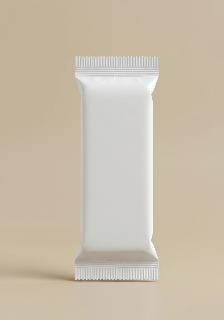 photograph of a blank, white, closed protein bar wrapper that is taller and has a more rectangular shape due to less wide angled edges at the top and bottom. The bar has a subtle paper texture with more wrinkles to make it look less perfect and more realistic. The protein bar wrapper is against a light beige background with natural lighting. Take the photo from the front.