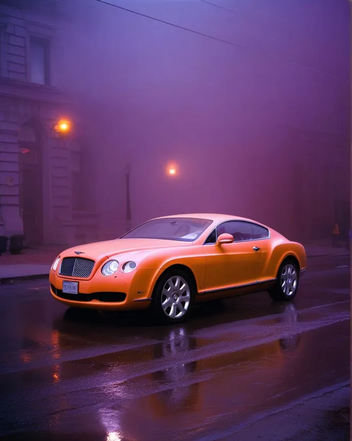 Bentley Continental GT is on fire on an empty street in foggy night new york avenue