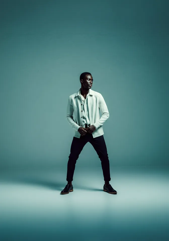 A Black male model in a photo studio, blue textured backdrop behind him, Gabriel Moses style, super realistic, shot on film, high end camera, editorial fashion