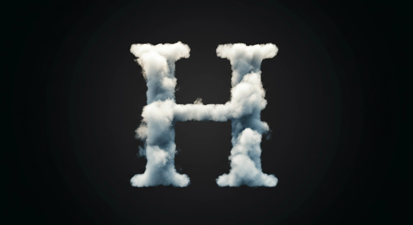 A beautifully crafted letter 'H' made entirely from soft, fluffy cotton clouds, floating gracefully against a solid black background. The clouds should have a delicate, airy texture with subtle highlights to emphasize their softness and lightness. The letter's form should be clear, yet organic, with slight natural irregularities in the cloud shapes to create a realistic, billowing effect. The overall design should be minimal, with the contrast between the soft, white clouds and the stark black background drawing attention to the intricate cloud details. Digital art style, clean and simple, yet strikingly elegant.