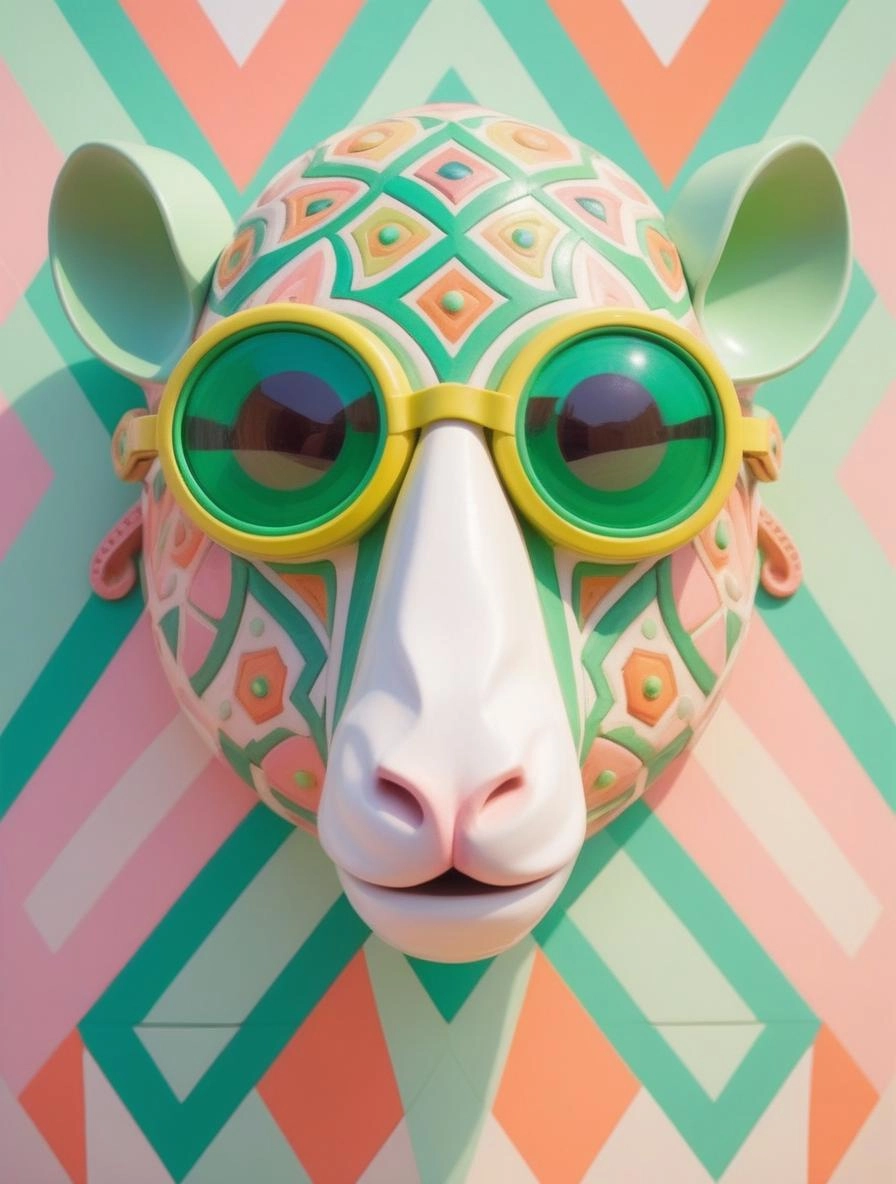 front view close up 3d render of a stylized retro futuristic tribal Alebrije mask portrait with quirky goggles and colorful elaborate geometric patterns, Sheep