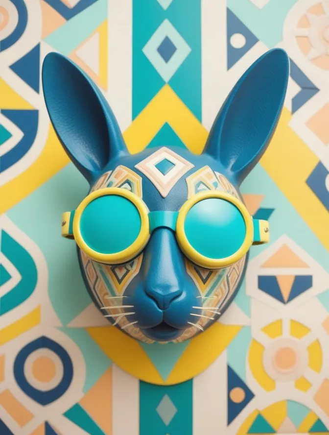 front view close up 3d render of a stylized retro futuristic tribal Alebrije mask portrait with quirky goggles and colorful elaborate geometric patterns, Rabbit