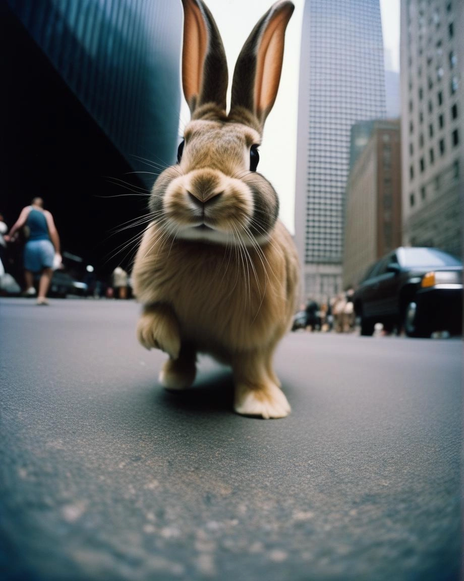 a realistic giant lop bunny walking upright through a busy city with skyscrapers in the style of fuji film and kodak portra 400, '70s style ads