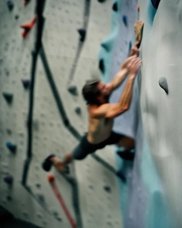 a climber training on his bouldering gym, latching to the next hold with chalk-dusted fingers