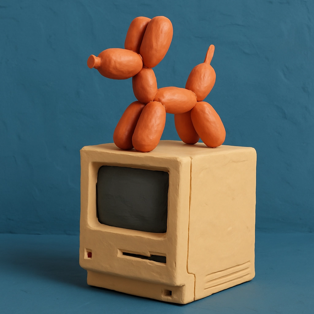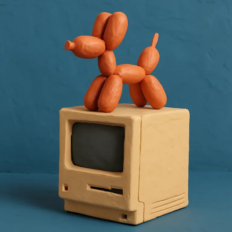 Create a claymation 3d illustration of a balloon dog animal sitting on top of a retro Mac II computer