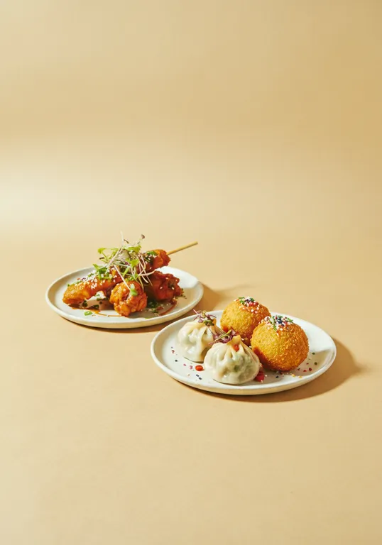 multiple tasty casual looking vibrant finger food dishes, chicken wing and yakitori, vada potato balls, dumpling and samosa all sprinkled on top and garnishes on a matter bistro plates on a single color light brown #A8948F cardboard background with imperfections, art directed, art by Rinko Kawauchi, garnishes, super detail, shot in isometric angle, white space, dreamy lotiphotography, colourtul, warm soft light, shot on fujifilm x14