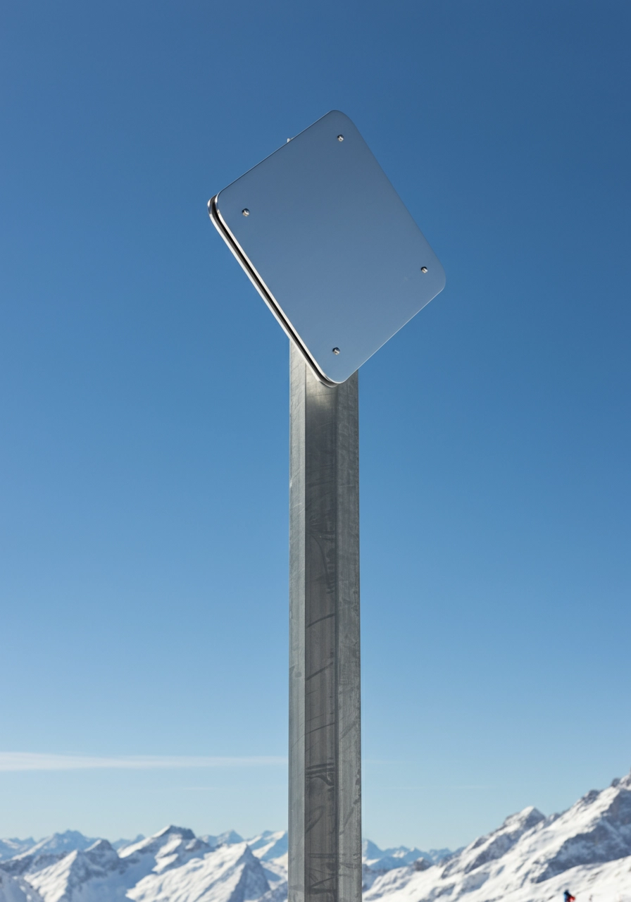 create a silver sign that will live mid-mountain at a ski resort, the overall design should be 4 feet tall. the design is on one silver post with a square silver sign that is angled up for easy viewing