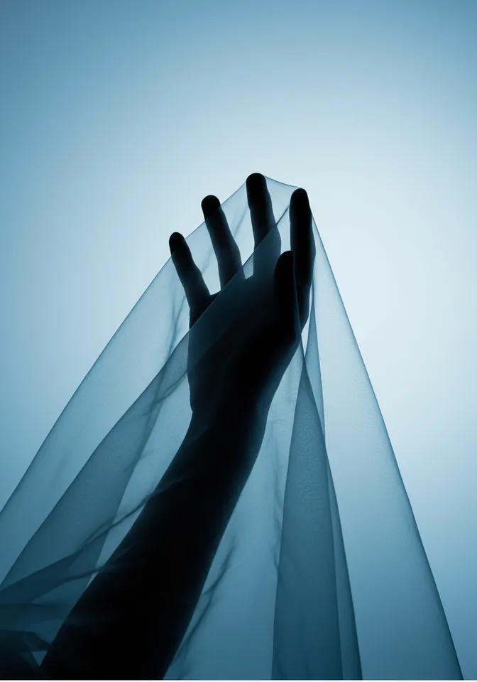 A dark silhouette of a hand reaches upwards, partially shrouded in a translucent, light blue fabric. The background is a soft gradient of pale blue, creating a serene, ethereal atmosphere. The light is diffused, casting soft shadows and highlighting the fabric's texture. The perspective is close-up, focusing on the gentle drape of the fabric and the subtle details of the hand’s silhouette. The composition conveys a sense of delicacy and tranquility, emphasizing the interplay between light and fabric.