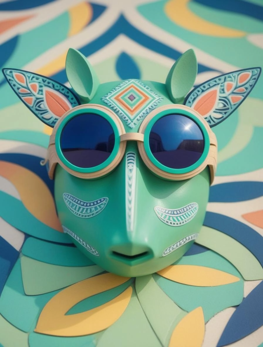 front view close up 3d render of a stylized retro futuristic tribal Alebrije mask portrait with quirky goggles and colorful elaborate geometric patterns, Humming Bird