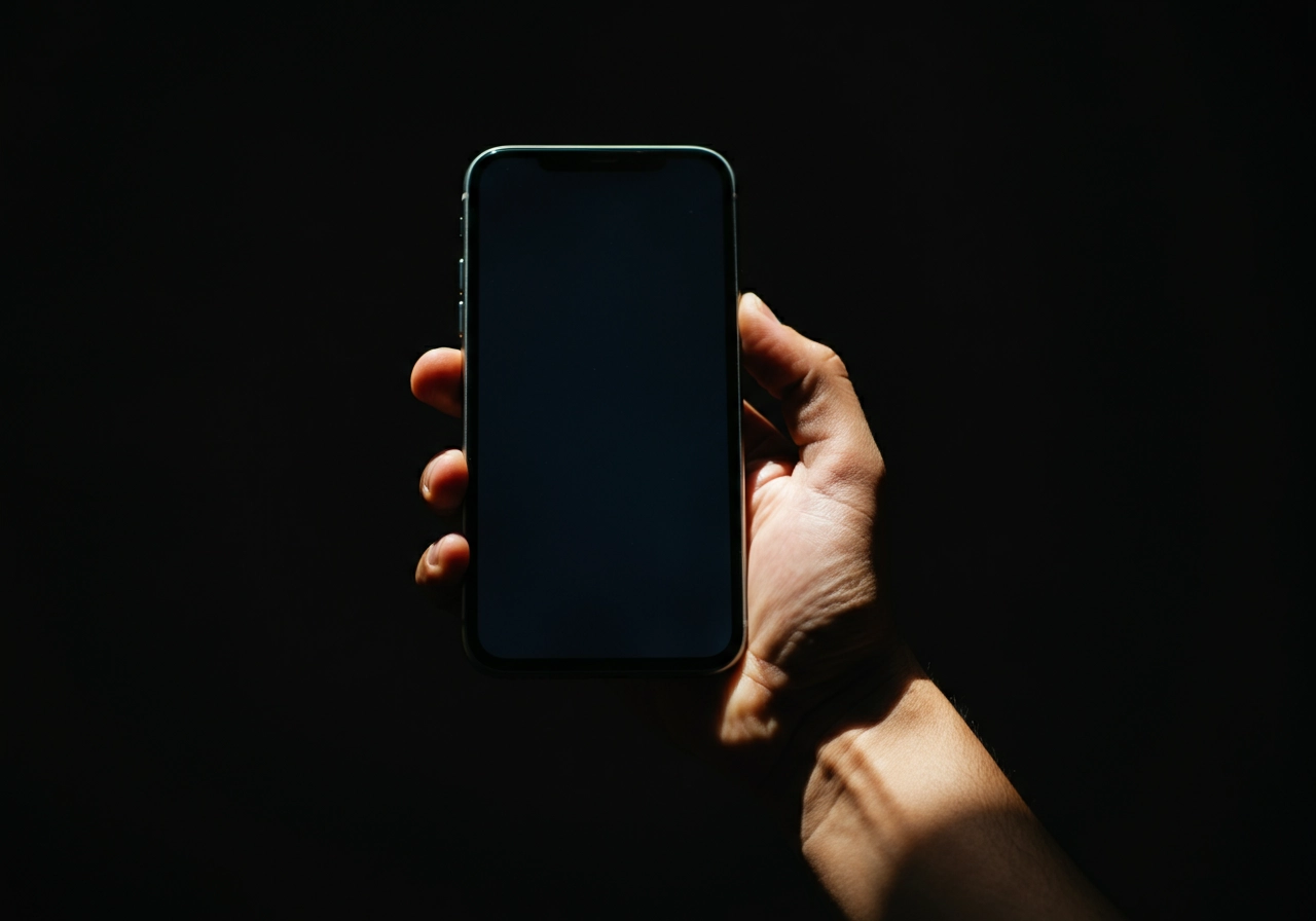 pantalla de movil para crear un mockup con fondo oscuro y solo iluminado por el reflejo de la pantalla y que lo sostiene una mano