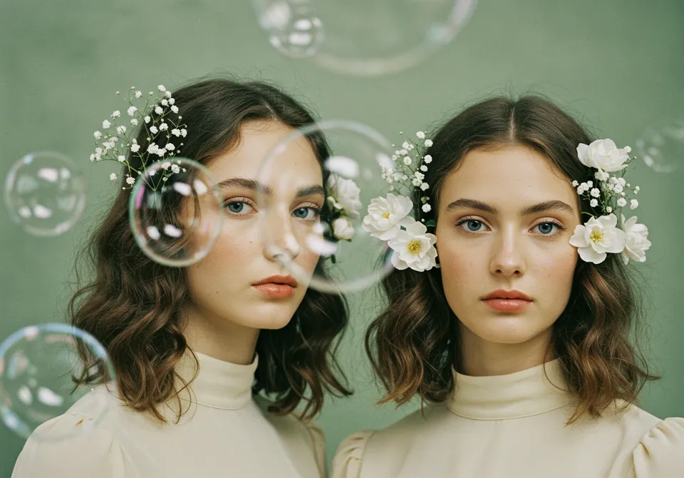 A dreamy and ethereal portrait of two young women with soft wavy hair, wearing light cream high-collar blouses, standing in front of a muted pastel green background, delicate white flowers intertwined with their hair, their faces partially seen through large transparent bubbles, soft natural lighting, serene and surreal atmosphere, fine art photography style, highly detailed, gentle and harmonious color palette of greens, whites, and creams