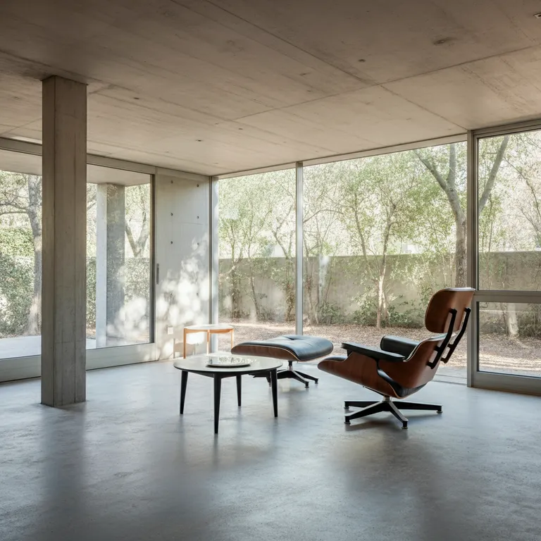 Minimalist room with floor-to ceiling windows, concrete floor, natural light from the outside, in the style of Tadao Ando, this scene embodies minimalism's focus on clean lines, open spaces, and natural elements, minimal mid century furniture, shot taken with Leica M6.