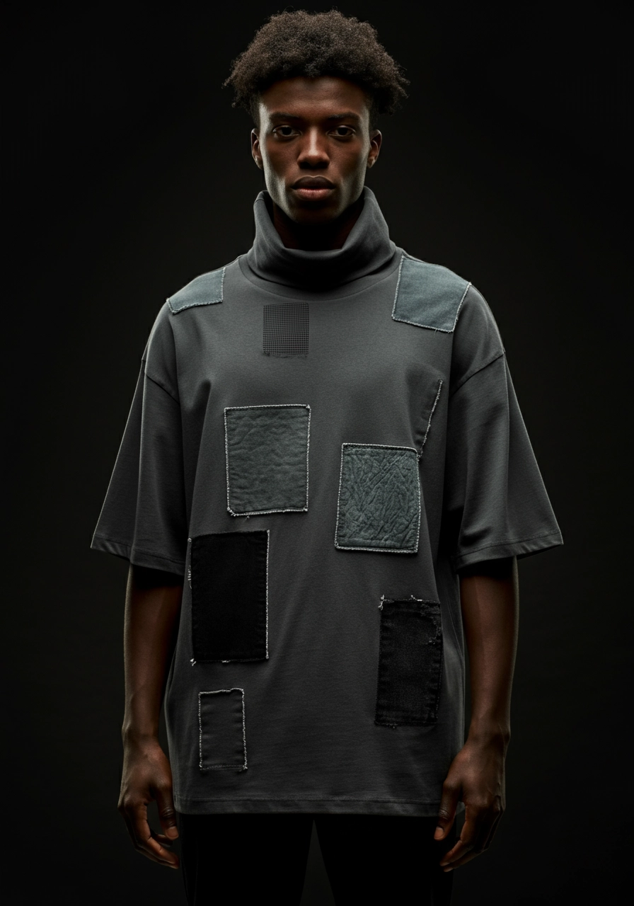 “Design a hyper-realistic oversized T-shirt for 2024 fashion, inspired by Represent Brands. The T-shirt should have a modern, minimalist aesthetic with a turtleneck. The design features strategically placed patches with varying textures and colors, creating a unique and contemporary look. The shirt should be displayed on a model in a professional, high-fashion setting. Include detailed photorealistic fabric textures and shadows. The background should be clean and stylish, highlighting the T-shirt without distractions. Use cinematic lighting to enhance the fabric details and give a polished, editorial-quality appearance. Ensure the image has a high level of detail, 4K resolution, and HDR settings to capture every nuance of the design. The model should be posed naturally, showcasing the T-shirt’s fit and design effectively.” photorealistic details”creating a surreal yet hyper-realistic vision of futuristic style. –ar 16:9 –hd –v 5 –q 2 –style 4c –detail 25 –s 750 –chaos 20 –testp”