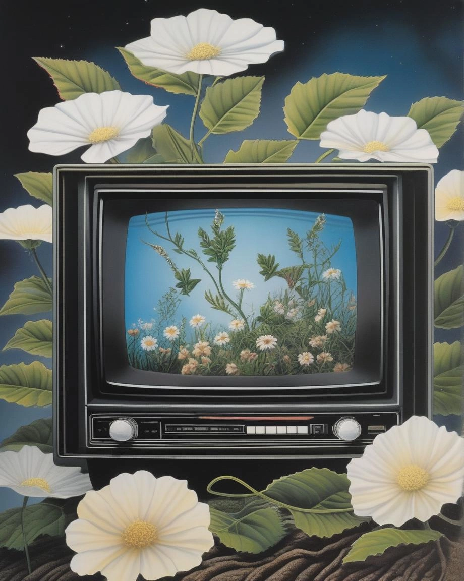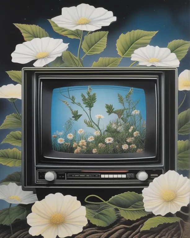 an old black television with leaves and white flowers growing out of the screen, '70s style ads