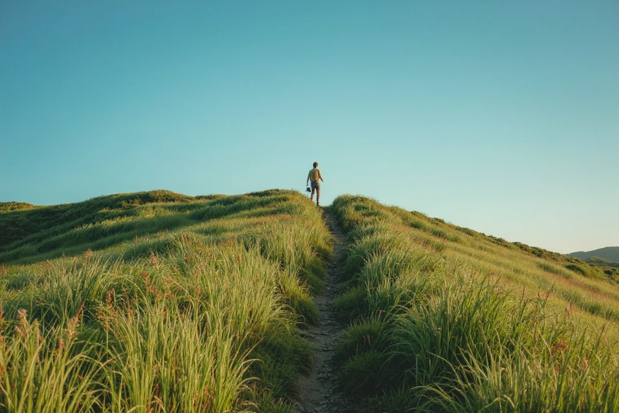 A hiker in motion, far in the distance, holding a camera in one hand.