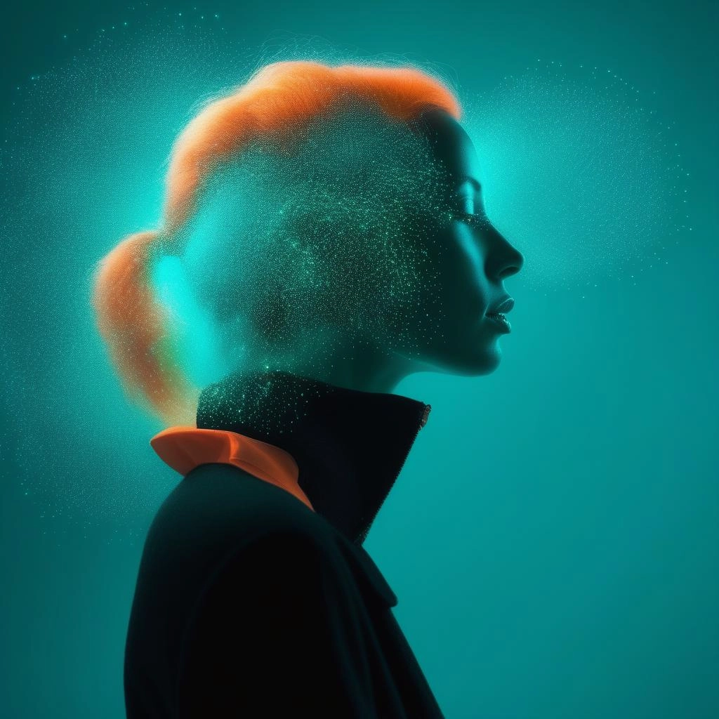 Woman in profile with neon orange floating particles, ethereal and surreal atmosphere, teal background, minimalist conceptual art.