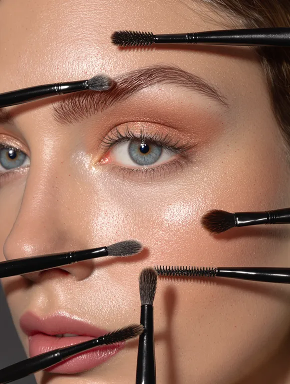 High-resolution close-up of a fair-skinned woman's face with visible freckles and realistic texture. The focus of the image is on the model's right eye, which is light blue in color and perfectly centered. The upper eyelid is lightly marked with shimmery eyeshadow in a soft copper tone, the upper lashes are long, curled and well-defined, and the eyebrow is thick, combed upwards with a natural and well-defined finish. The scene consists of six black combing brushes, strategically positioned around the right eye. Two brushes are facing the eyebrow (one above and one to the side to the right), two in the lower lash region (one near the outer corner and one in the center, below the eye), one near the inner corner of the left eye and another on the left side of the image, facing the face. Each brush has visibly detailed bristles and a matte texture, with variations in orientation that create a dynamic aesthetic composition. The lighting is diffuse and soft, revealing the natural glow of the skin, the pores, the density of the freckles and the light healthy oiliness of the cheek area. The image conveys an editorial feeling of refined and technical beauty, with a focus on the elongated eyelashes. This composition is ideal for cosmetic campaigns focused on the eyes, such as eyelash extensions, reinforcing the professional, detailed and high-end aesthetic.