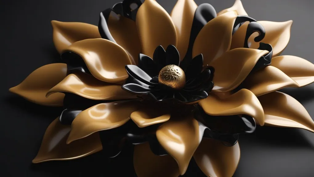 Black, glossy studio abstract background with a lot of negative space, gold wavy abstract flower, dripping goo from the flower, black dominant color, hyper-realistic 3D rendering