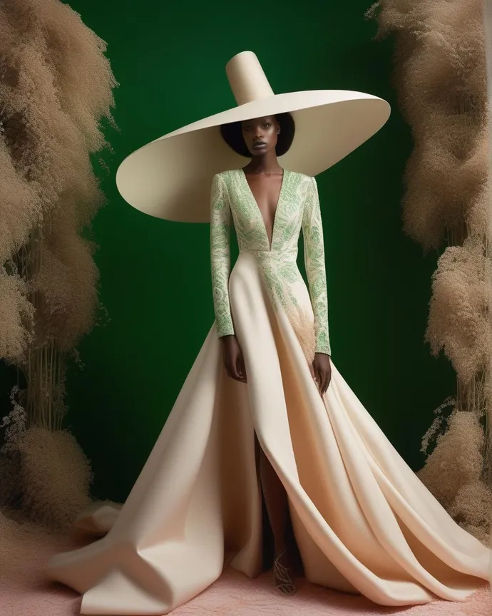 model wearing a drees haute couture wide sculptural draping neutrals colors sophisticated the model wear a asymetrical hat inspired by Persian siah mashq calligraphy and with white and green color and shining , elegance, ,photography ,realistic ,fashion editorial ,style of Sofia Lind, minimalistic ,white backgroun, 3d render