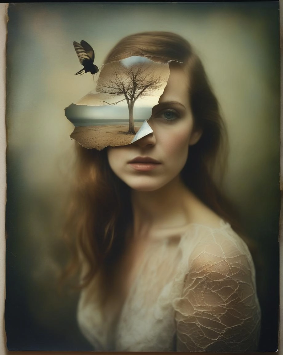 double exposure complex art by Alex Stoddard, Natalia Drepina and Brooke Shaden surreal postcard on a cracked paper, extremely dynamic, unusual , vintage