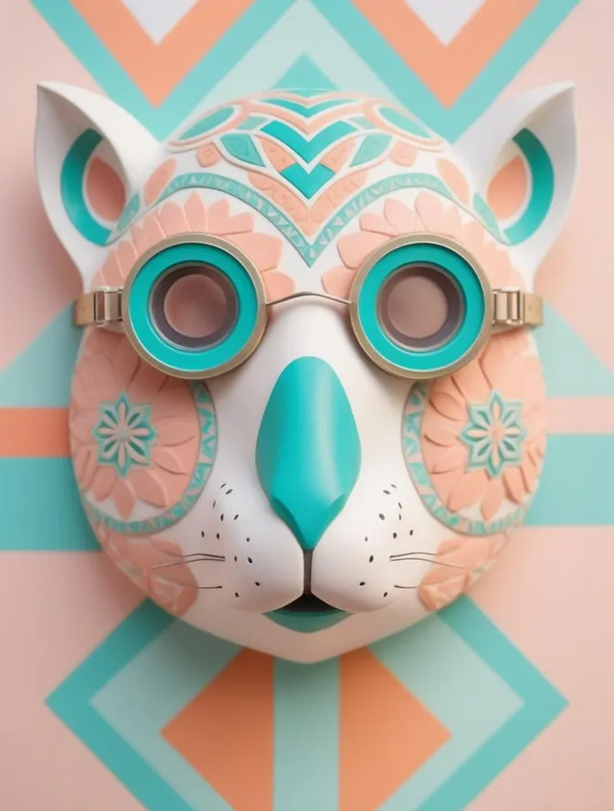 front view close up 3d render of a stylized retro futuristic tribal Alebrije mask portrait with quirky goggles and colorful elaborate geometric patterns, Squirrel