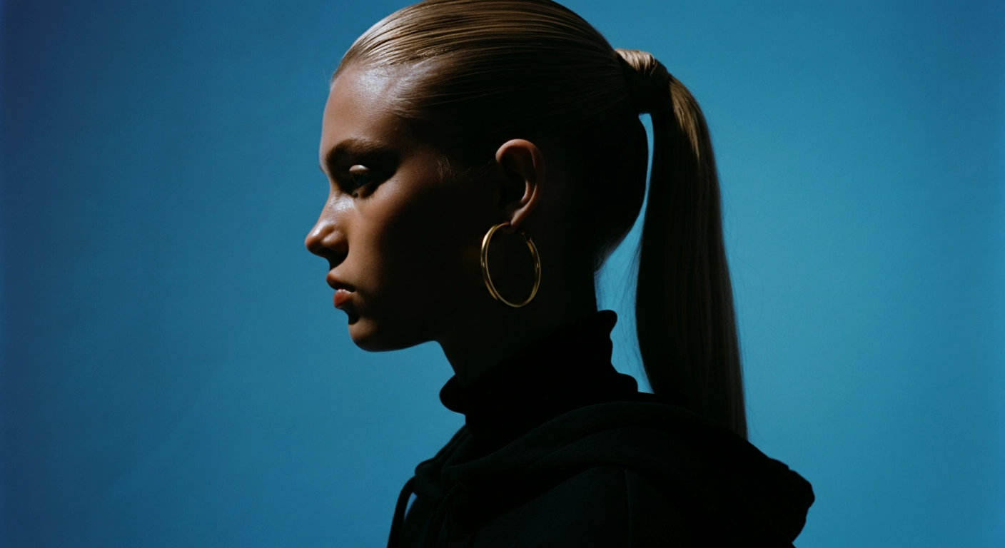 photographic picture, silhouette of a young cool blonde with a ponytail and gold hoop earrings wearing high-end fashion, background is blue, clothing is minimal, hyperrealistic scene, the model is just slightly visible due to dark shadows, they are wearing a black sweatshirt with a hood down, stylize 250 --ar 3:4 --v 6