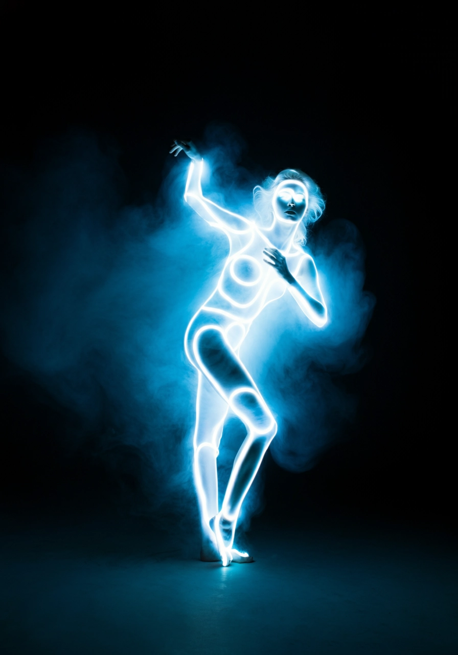 Glowing white women shaped figure, the figure is radiating blue light