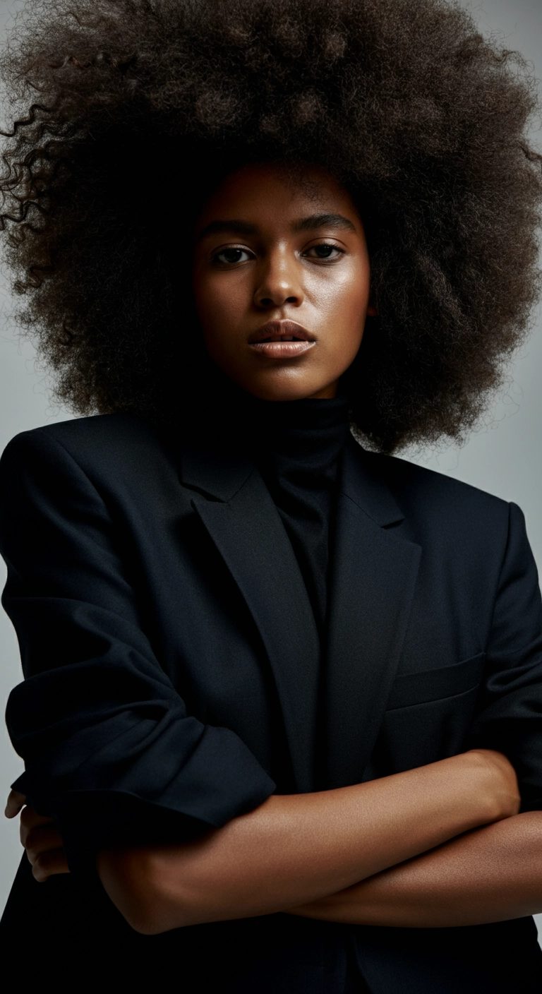 Create a black woman with curly hair + photo taken from a Canon EOS 5D Mark IV with the Voigtländer NOKTON 50mm F1 Aspherical VM lens + hyper realistic + professional light + cinematography + white background + isolated background