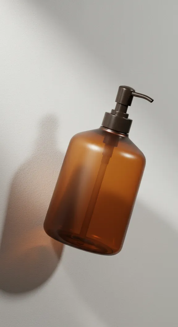 A minimalist amber liquid soap dispenser tilted slightly for a more dynamic feel, set against a textured white wall with subtle shadows. The dispenser's sleek, modern design is emphasized by its warm, matte finish. Soft, natural lighting creates gentle highlights on the curved surface, and the shadow casts a delicate contrast. The composition focuses on the product from an angled perspective, evoking a clean and contemporary atmosphere.