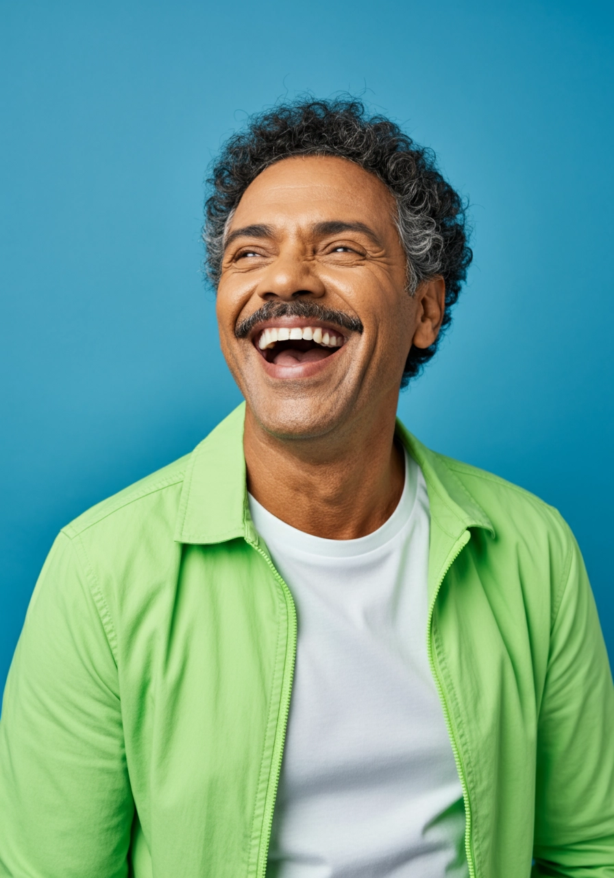 A portrait of a joyful 50-year-old Brazilian man laughing with his head tilted back and mouth open in a natural, expressive smile. He has medium-dark skin, short curly hair with hints of gray, and a neatly groomed mustache. His facial expression radiates warmth, authenticity, and confidence. He wears a casual outfit: a vibrant neon green jacket (#45e554) over a white t-shirt. The look is simple and stylish, with no visible logos or patterns — just clean, contemporary lines that reflect a relaxed yet expressive vibe. The background is a solid, evenly lit blue in #0177ef, smooth and textureless. Lighting is soft and diffused, creating gentle contrast to highlight the subject while maintaining a polished, editorial feel. The overall composition is bold, modern, and upbeat.