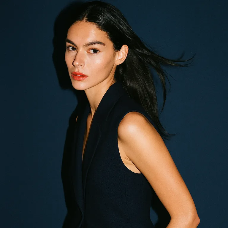 a black hair usa supermodel portrait,dynamic portrait pose,fashion photography,high end editorial,minimal,navy blue,studio portrait,against navy blue background