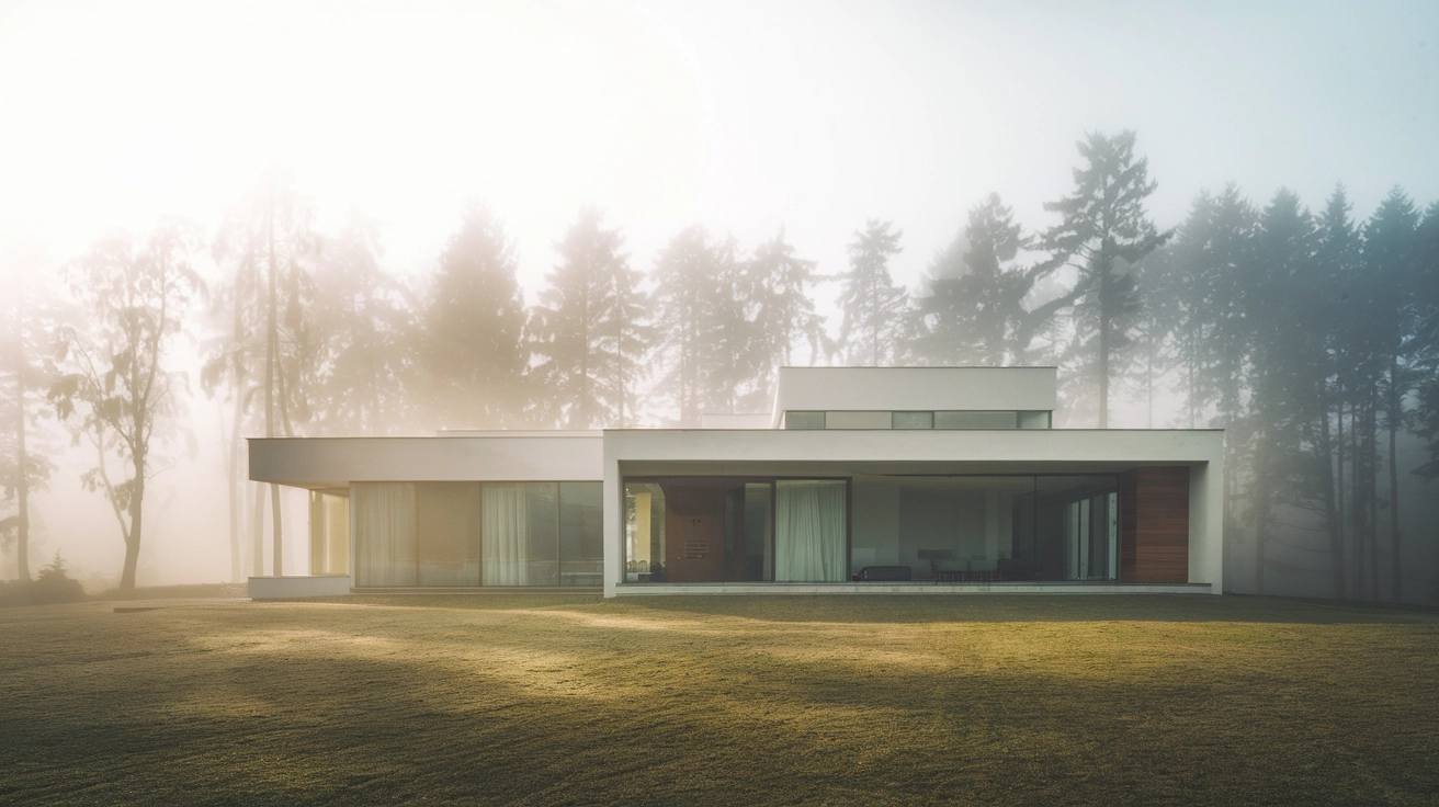 A modern, minimalist house with clean lines sits alone on a grassy expanse, surrounded by a misty forest of tall trees. The building's exterior is predominantly white with large glass windows and wooden accents, giving it a contemporary feel. Soft, diffused sunlight filters through the mist, creating a serene, tranquil atmosphere. The perspective is straight on, showcasing the symmetry of the house against the backdrop of the ethereal, fog-laden forest. The overall mood is calm and contemplative, with a mix of warmth from the sun and coolness from the mist.