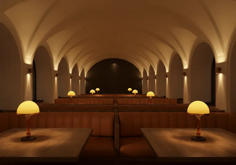 Render a photorealistic lighting study of a vaulted-ceiling restaurant interior **without any ceiling fixtures**. Illuminate exclusively with: - Warm-white (2700K) arandelas discretas embutidas atrás dos arcos, projetando luz suave para cima. - Amber glass table lamps on each wooden table for localized pools of golden light. - Small pillar candles for additional ambient accent. No overhead lights or LED strips. Show warm color rendering on white plaster arches, caramel-toned banquettes, and honey oak floors, with smooth fall-off and gentle shadows. The result should feel intimate, cozy and texturally rich.