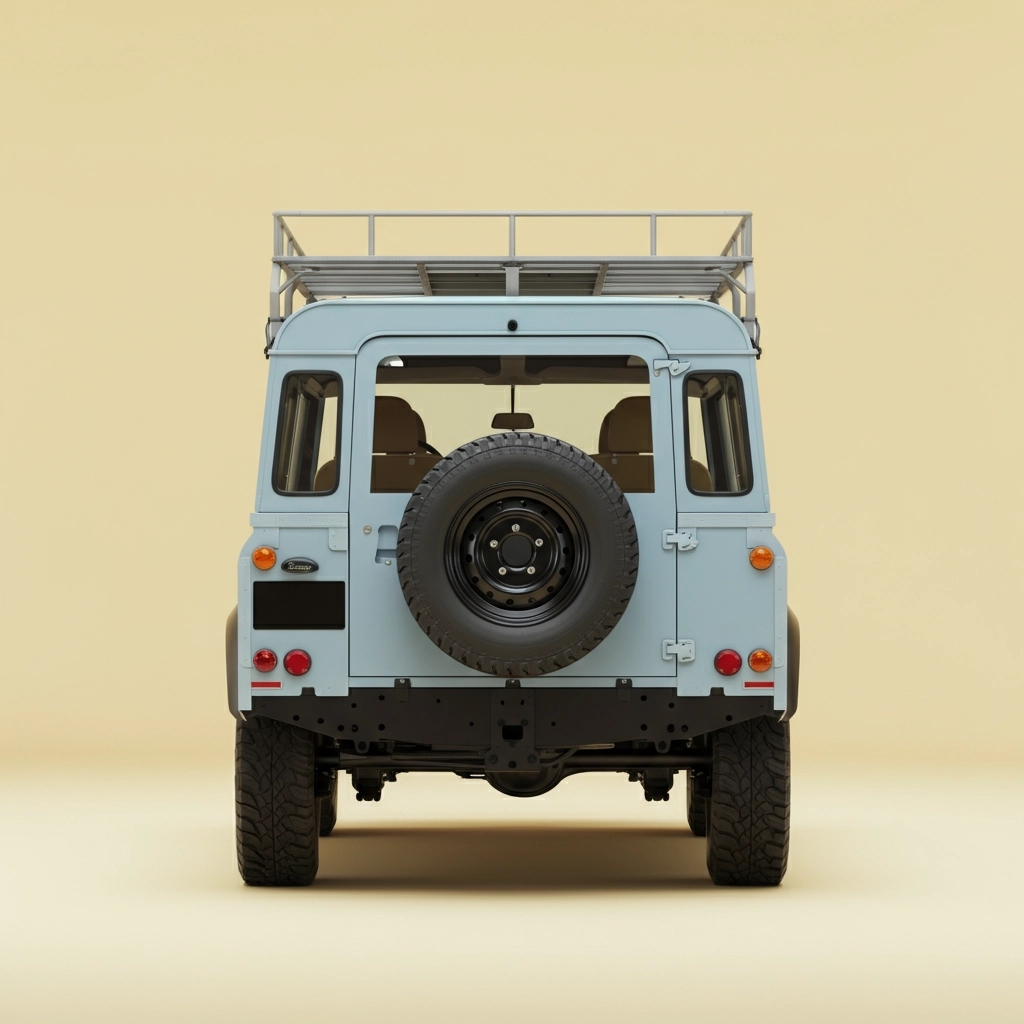 A hyper-realistic 4K studio photograph of the centered rear view of a vintage Land Rover defender in slate blue. The vehicle is centered and presented with accurate proportions and fine detail, including a roof rack, spare tire with leather cover show the texture of the leather ,rear windows. The backdrop is a soft, light butter yellow, evenly lit to highlight the contours and texture of the car. The overall image is crisp, clean, and professional, resembling a high-end automotive showroom shot