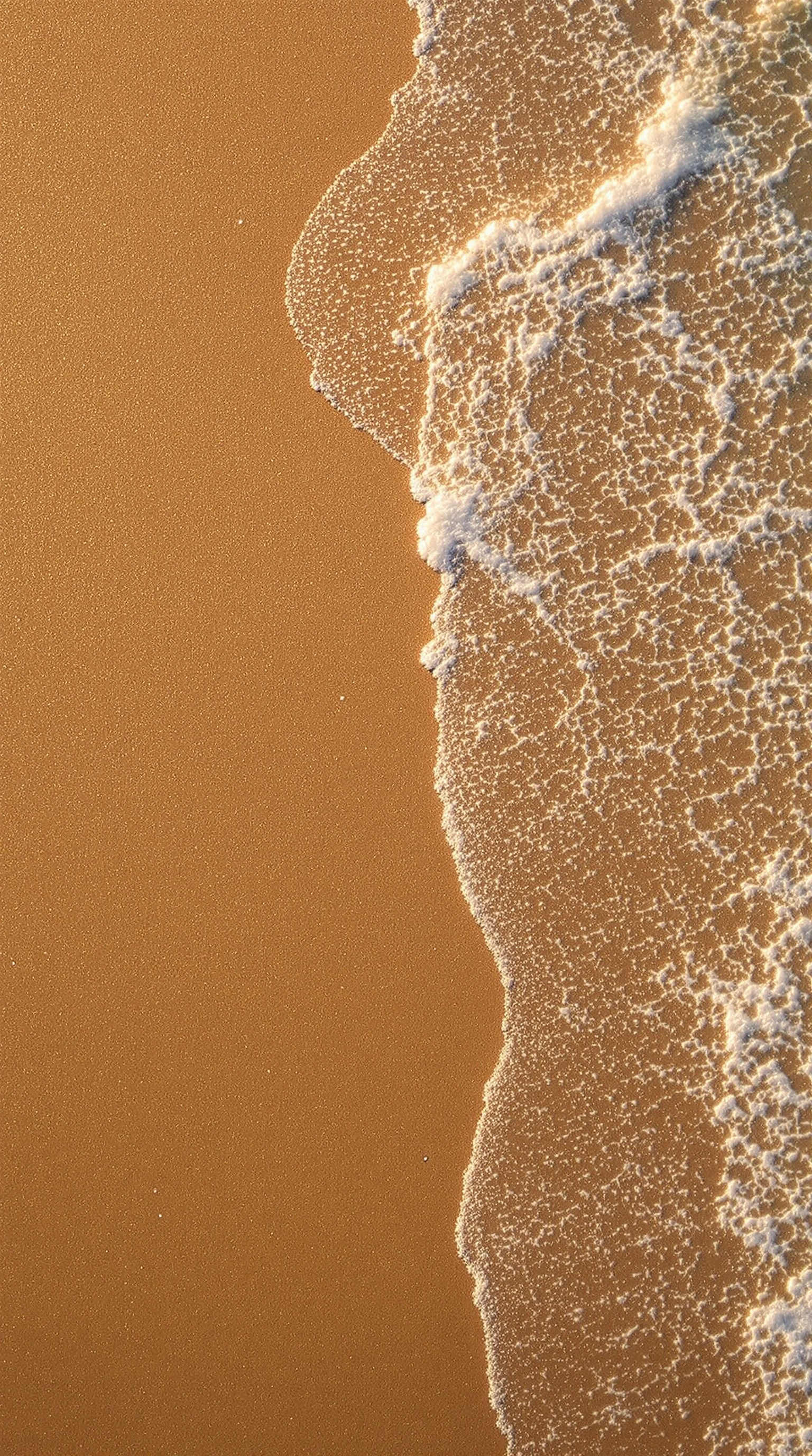 Hyperrealistic top view of beach sand with ocean waves gently flowing in and out. Captured in golden hour hard light using a Panasonic Lumix GH5 with a cine lens, overhead angle, subtle zoom-in motion, strong contrast and leading lines emphasizing texture and wave movement, no additional objects or elements visible in the scene, 9:16 format.